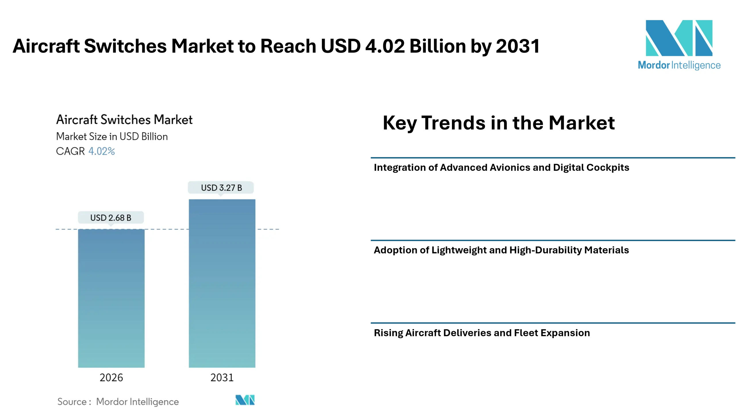 Home Press ReleasesAircraft Switches Market to Reach USD 4.02 Billion by 2031, Supported by Advanced Avionics Integration and Rising Aircraft Production – Mordor Intelligence