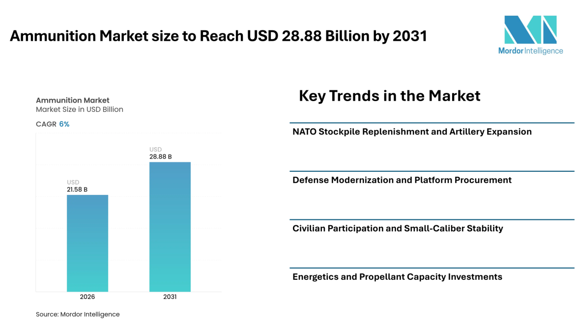 According to Mordor Intelligence, the ammunition market size is expected to grow from USD 21.58 billion in 2026 and is forecasted to reach USD 28.88 billion by 2031, registering a CAGR of 6.00% during the forecast period. Sustained defense procurement programs, artillery stockpile rebuilding initiatives, and modernization plans across allied nations are supporting ammunition market growth.