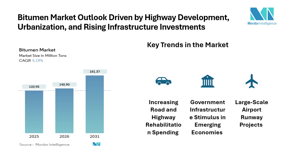 The global Bitumen Market has been experiencing steady growth as governments and private sectors intensify investments in infrastructure. The bitumen industry is expected to grow from 140.9 million tons in 2026 to reach 181.37 million tons by 2031, reflecting a compound annual growth rate of over 5% during the forecast period. Key factors driving this growth include increasing public-sector spending on roads, highways, and airport runways, as well as the rising adoption of polymer-modified bitumen for climate-resilient pavements.