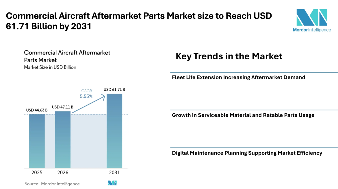 Commercial Aircraft Aftermarket Parts Market size to Reach USD 61.71 Billion by 2031 as Fleet Life Extension and Predictive Maintenance Influence Market Trends – Mordor Intelligence
