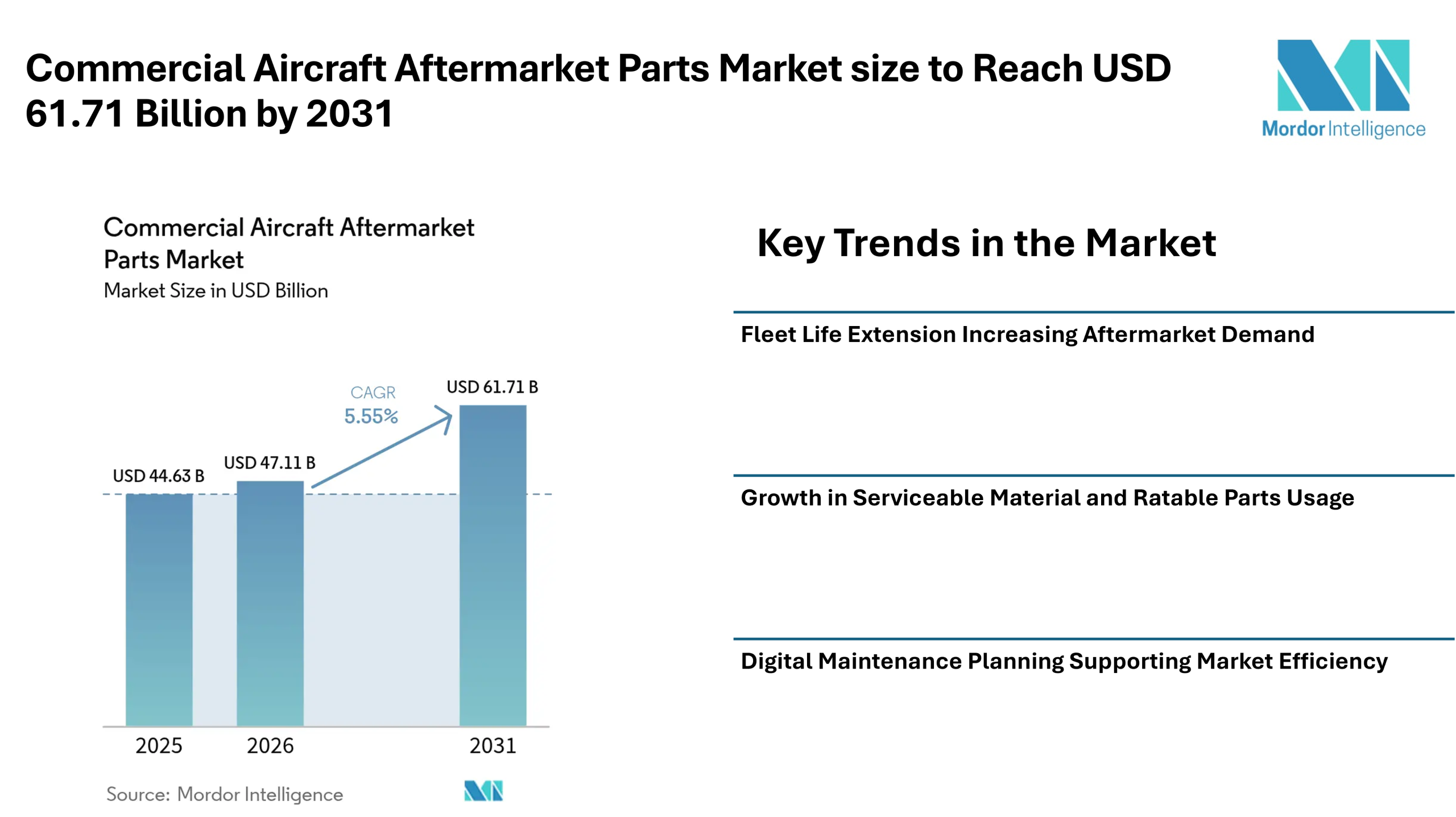 According to Mordor Intelligence, the commercial aircraft aftermarket parts market size is expected to increase from USD 44.63 billion in 2025 to USD 47.11 billion in 2026, with the commercial aircraft aftermarket parts market forecast indicating it will reach USD 61.71 billion by 2031. This steady rise reflects a consistent need for replacement parts, maintenance services, and lifecycle support across global airline fleets.