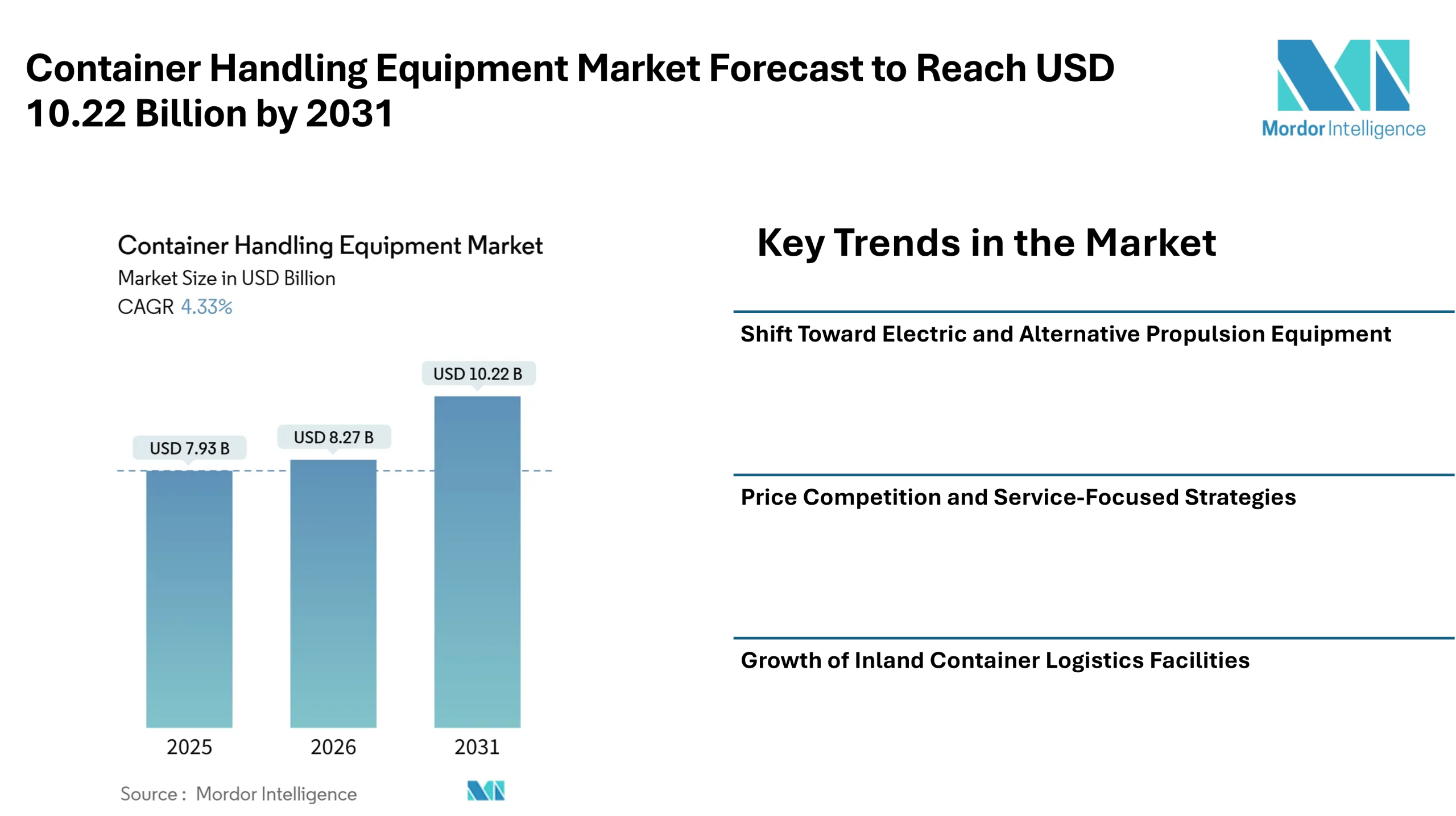 According to Mordor Intelligence, the container handling equipment market size is expected to grow from USD 7.93 billion in 2025 to USD 8.27 billion in 2026, with the container handling equipment market forecast indicating it may reach USD 10.22 billion by 2031. This progress reflects consistent investments in cargo handling infrastructure and modern equipment used in terminals, depots, and freight facilities worldwide.