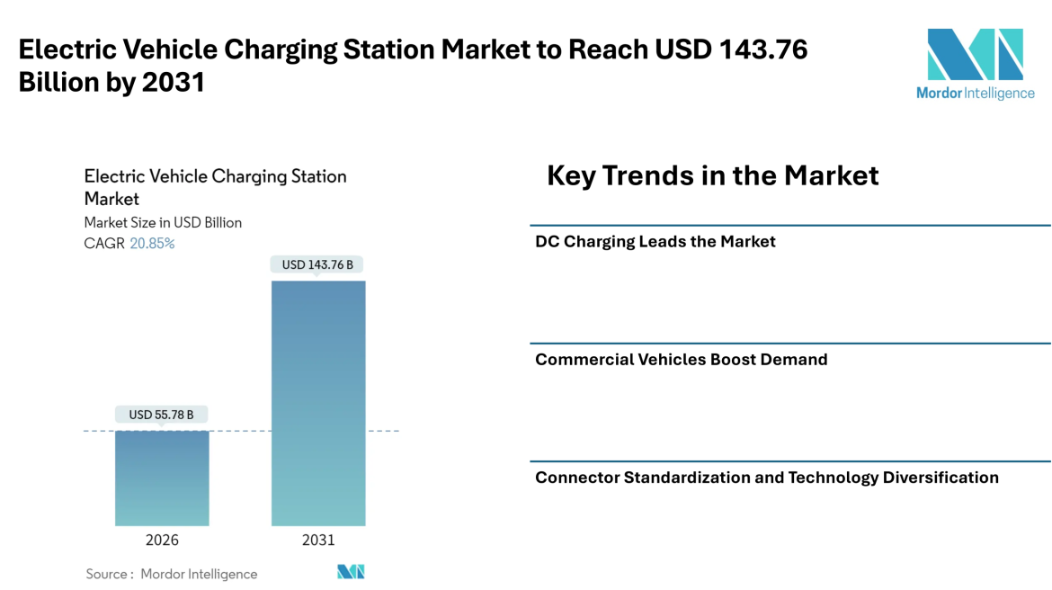 The global Electric Vehicle Charging Station market size is on a strong growth trajectory as the adoption of electric vehicles accelerates worldwide. According to Mordor Intelligence, the market was valued at approximately USD 55.78 billion in 2026 and is expected to expand to around USD 143.76 billion by 2031, growing at a robust CAGR during the forecast period. This expansion reflects growing demand for reliable charging infrastructure, advancing battery technologies, supportive government policies, and investments in both public and private charging networks.