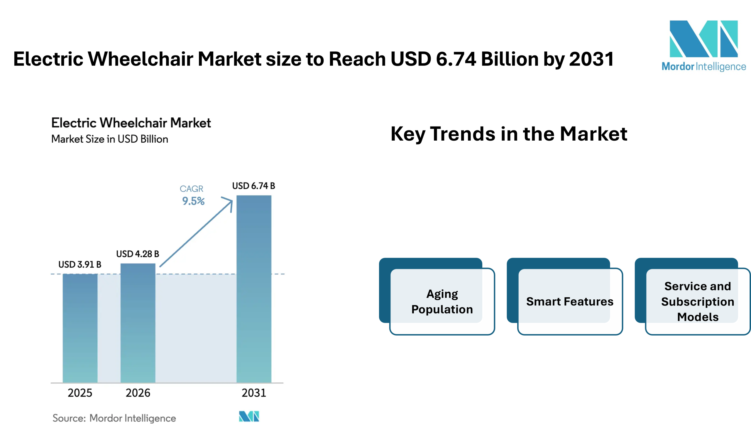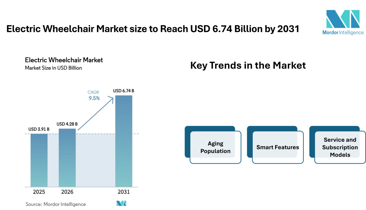 According to Mordor Intelligence, the electric wheelchair market size is estimated at USD 4.28 billion in 2026, rising from USD 3.91 billion in 2025, and is projected to reach USD 6.74 billion by 2031, reflecting a steady expansion with a 9.5% CAGR during the forecast period. These figures highlight the steady electric wheelchair market growth supported by demographic changes, healthcare needs, and improvements in assistive mobility equipment.