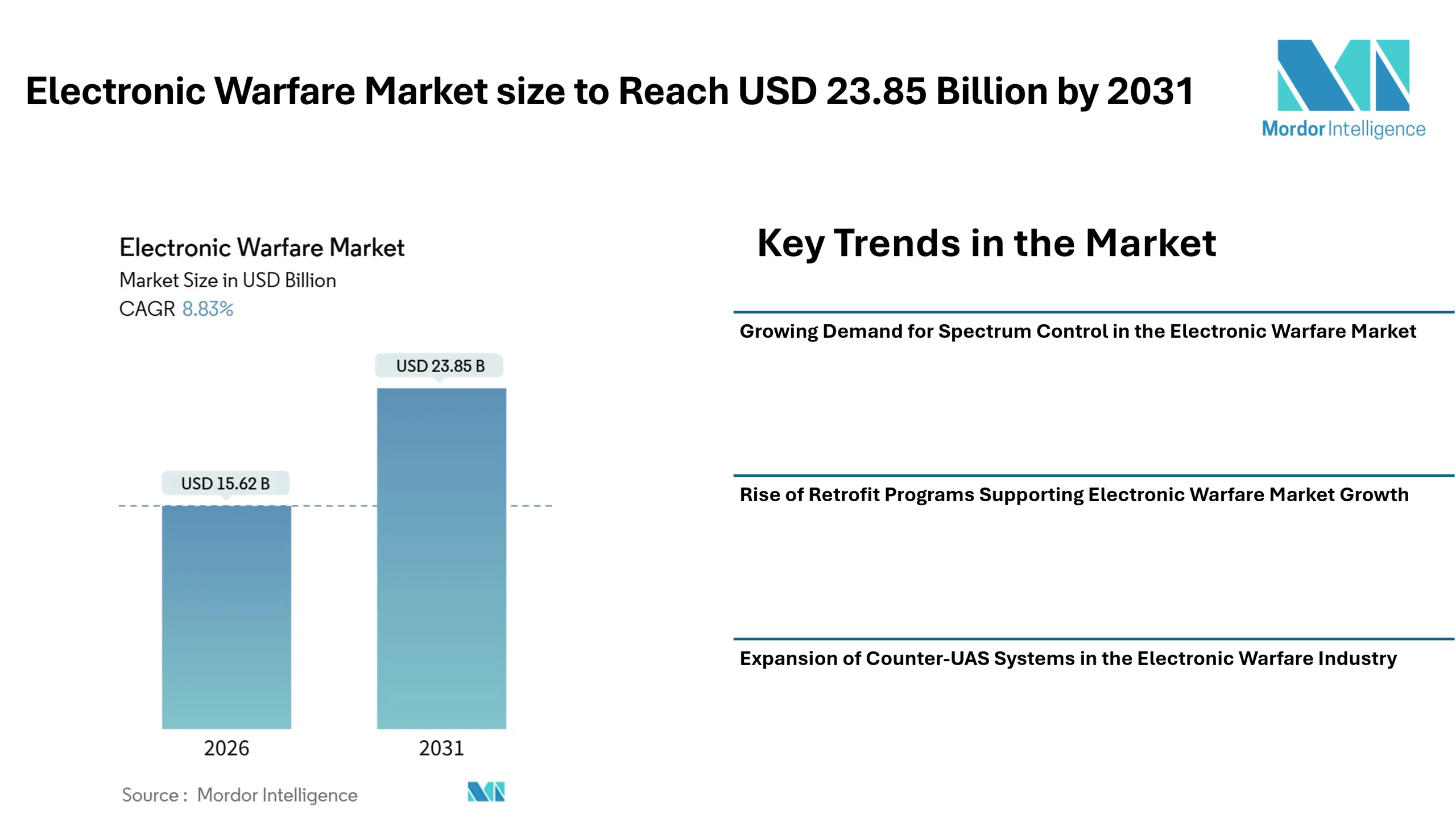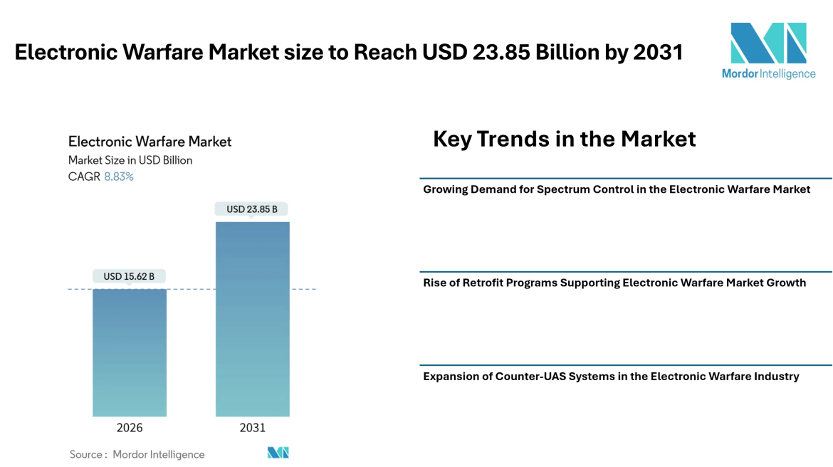 Electronic Warfare Market size to Reach USD 23.85 Billion by 2031 Driven by Spectrum Dominance Programs, Retrofit Demand, and Counter-UAS Expansion – Mordor Intelligence