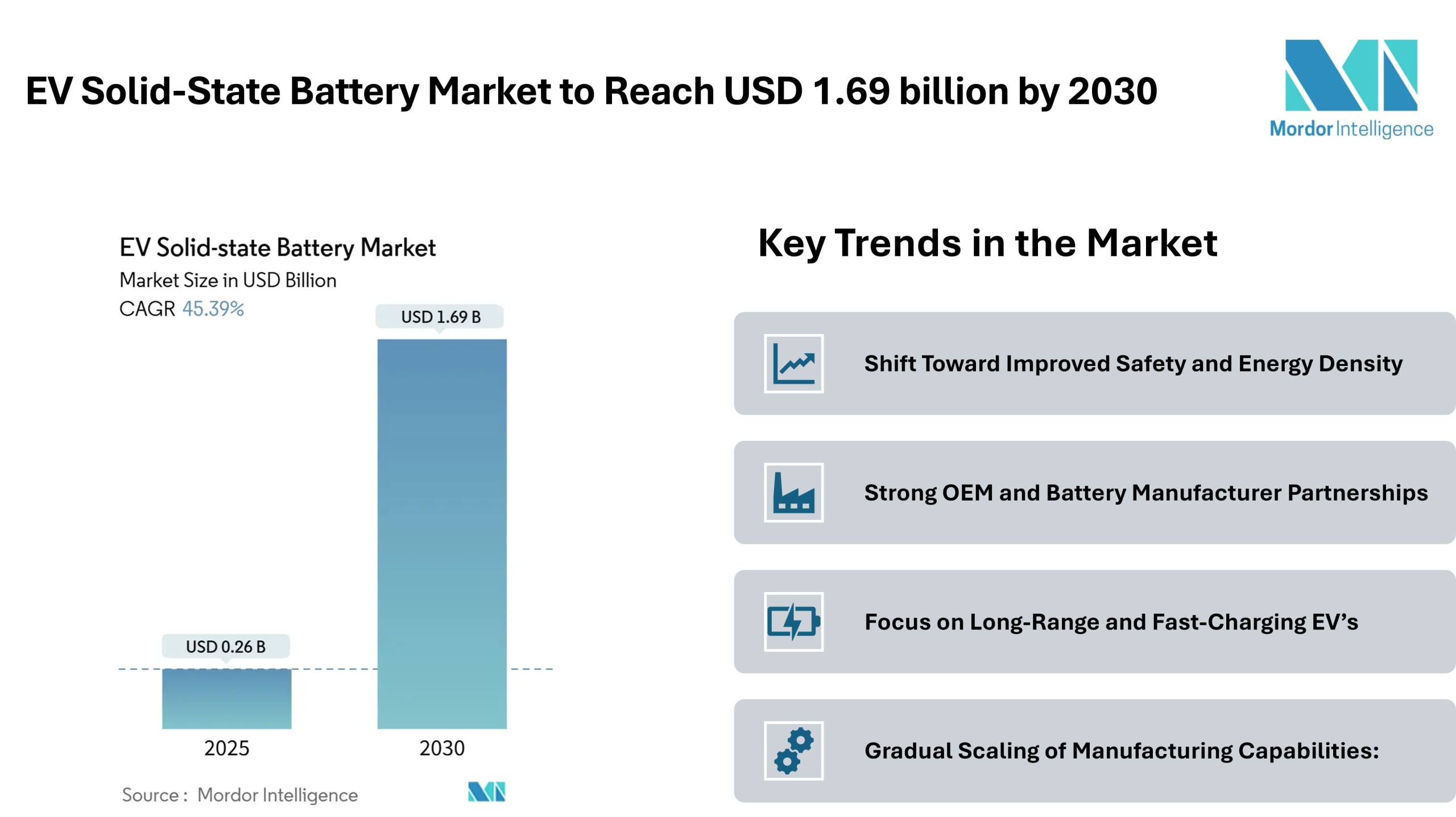 EV Solid-State Battery Market to Reach USD 1.69 billion by 2030, Driven by Safety-Focused Designs and OEM Integration – Mordor Intelligence