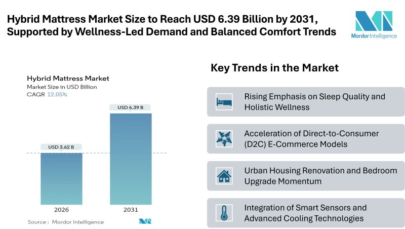 According to Mordor Intelligence, the Hybrid Mattress Market Size stood at USD 3.23 billion in 2025 and is expected to grow from USD 3.62 billion in 2026 to USD 6.39 billion by 2031. The market is gaining consistent traction within the global sleep products space as consumers seek mattresses that combine comfort, durability, and reliable support. This growth underscores the rising preference for hybrid constructions that blend innerspring systems with foam and micro-coil layers to deliver a balanced sleep surface.