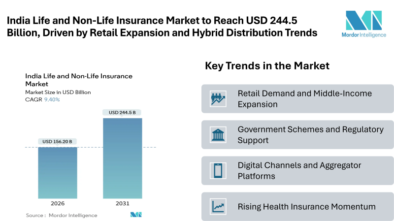 According to Mordor Intelligence, the India life and non-life insurance market size is valued at USD 156.2 billion in 2026 and is projected to reach USD 244.5 billion by 2031, reflecting a CAGR of 9.4% during the forecast period. This India life and non-life insurance market forecast highlights steady expansion across both protection and savings products, supported by regulatory clarity, rising income levels, and broader distribution reach.