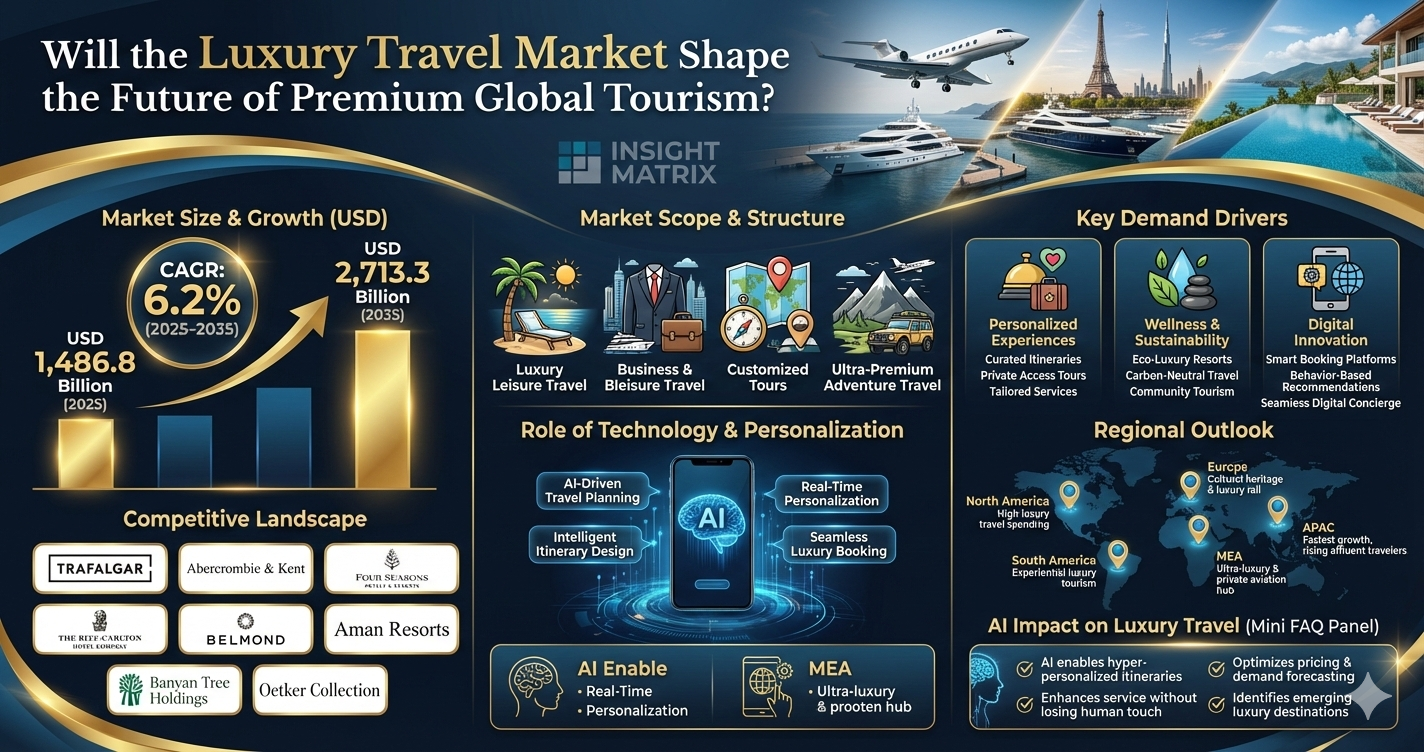 The Luxury Travel Market refers to premium travel services designed for affluent travelers seeking exceptional comfort, personalized services, and unique experiences. These services often include high-end accommodation, private transportation, curated itineraries, exclusive destinations, and concierge-level customer service.