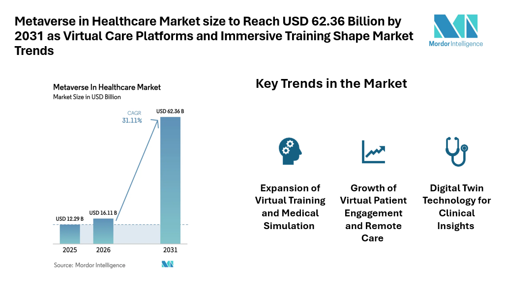 According to Mordor Intelligence, the metaverse in healthcare market size was valued at USD 12.29 billion in 2025 and is estimated to grow from USD 16.11 billion in 2026 to reach USD 62.36 billion by 2031, registering a CAGR of 31.11% during the forecast period. This expansion reflects the increasing interest in digital environments that allow healthcare professionals to interact with patients, data, and clinical tools in new ways.