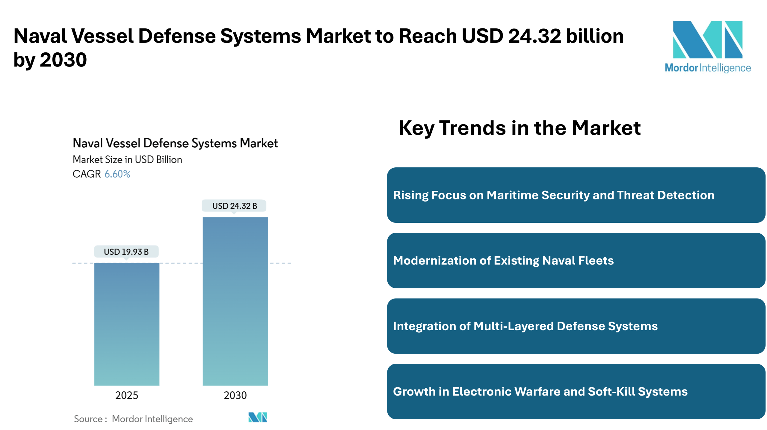 The Naval Vessel Defense Systems Market is projected to grow from an estimated USD 19.93 billion in 2025 to USD 24.32 billion by 2030, registering a CAGR of 6.60% over the forecast period from 2025 to 2030.