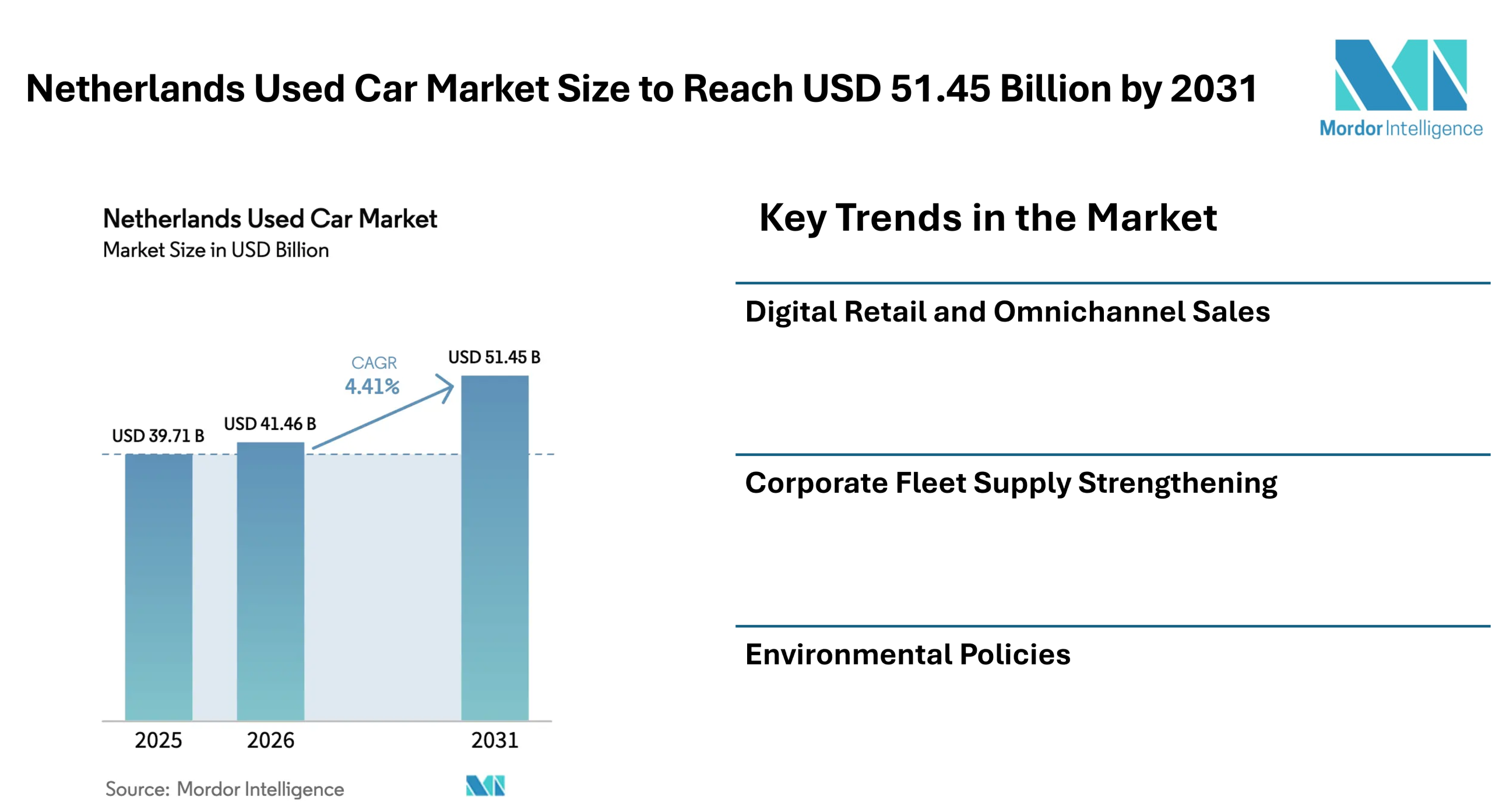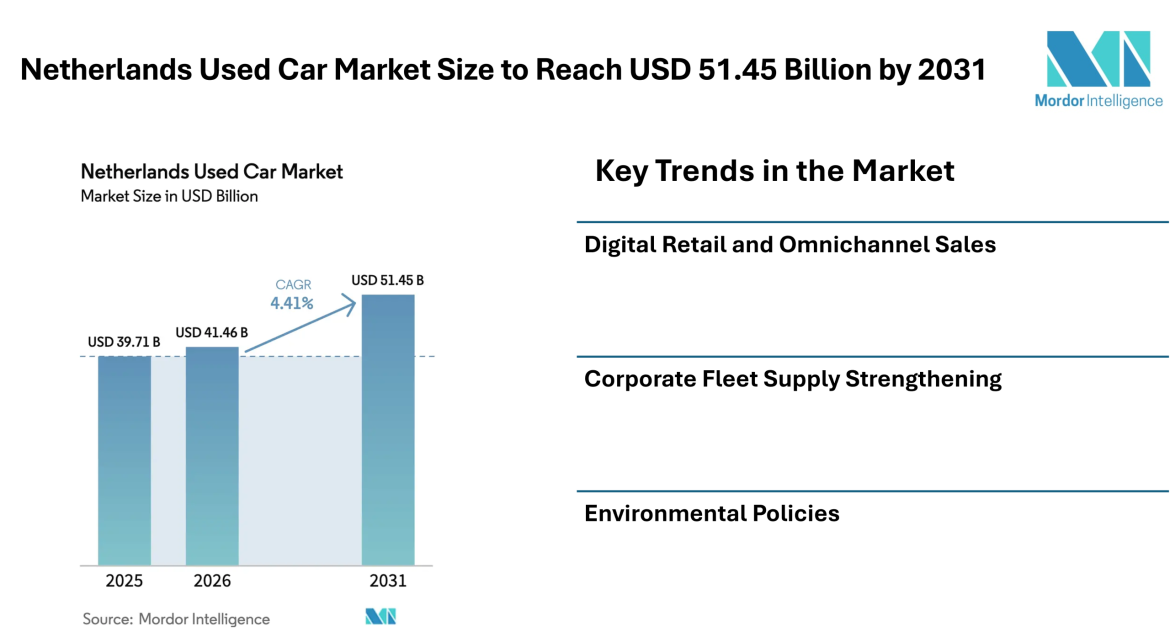 According to Mordor Intelligence, the Netherlands used car market size was valued at USD 39.71 billion in 2025 and is expected to reach USD 41.46 billion in 2026, with projections indicating the market could reach USD 51.45 billion by 2031. This outlook reflects stable demand across passenger vehicle categories and an active resale ecosystem supported by digital platforms and organized dealer networks.