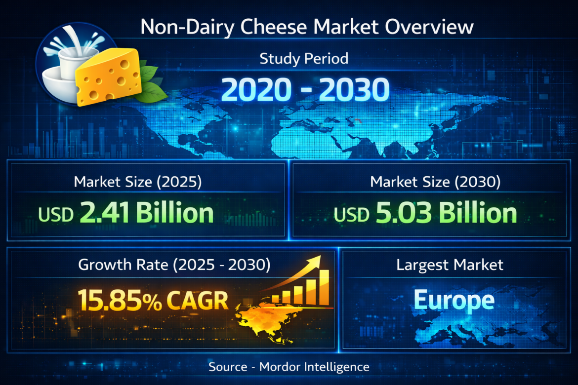 The non-dairy cheese market is entering a strong and sustained growth phase as consumers increasingly seek alternatives to traditional dairy-based products. According to Mordor Intelligence, the Non-Dairy Cheese Market size is valued at USD 2.41 billion in 2025 and is projected to reach USD 5.03 billion by 2030, reflecting robust expansion across retail and foodservice channels.