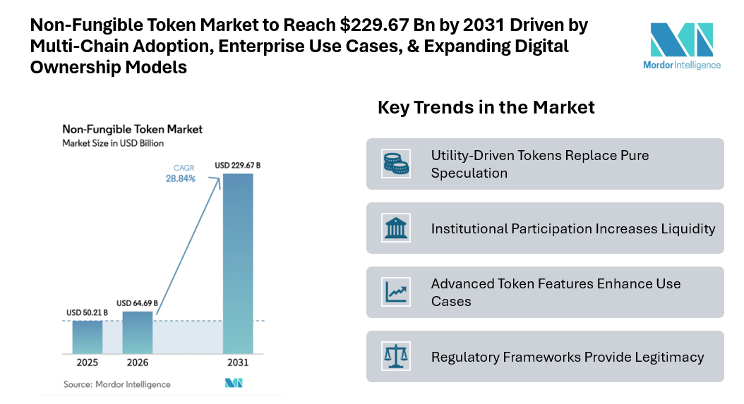 According to Mordor Intelligence, the non-fungible token market is projected to grow from USD 50.21 billion in 2025 to USD 64.69 billion in 2026 and is forecast to reach USD 229.67 billion by 2031, registering a CAGR of 28.84% during 2026–2031. This strong market growth reflects increasing adoption beyond speculative trading toward practical applications such as verified ownership, customer engagement, and supply-chain authentication. The token market is entering a new phase of expansion as digital ownership becomes part of mainstream commerce, entertainment, and brand strategy