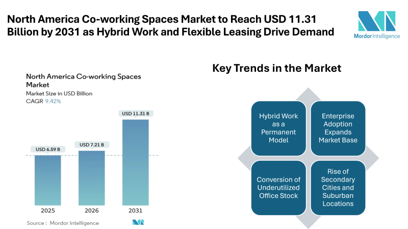 According to Mordor Intelligence, the North America co-working spaces market size was valued at USD 6.59 billion in 2025 and is estimated at USD 7.21 billion in 2026, projected to reach USD 11.31 billion by 2031, growing at a CAGR of 9.42%. This market growth reflects structural changes in how organizations use office space, especially as hybrid work becomes a long-term model rather than a temporary solution. Companies are prioritizing flexibility, cost control, and access to distributed talent, which is strengthening the North America co-working spaces industry across major cities as well as suburban locations.