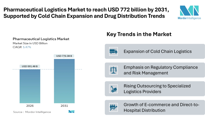 According to Mordor Intelligence, the pharmaceutical logistics market size was valued at USD 560.81 billion in 2025 and estimated to grow from USD 591.48 billion in 2026 to reach USD 772.38 billion by 2031, at a CAGR of 5.47%. The pharmaceutical logistics market plays a critical role in ensuring the safe, timely, and compliant movement of medicines, vaccines, biologics, and medical products across domestic and international supply chains.