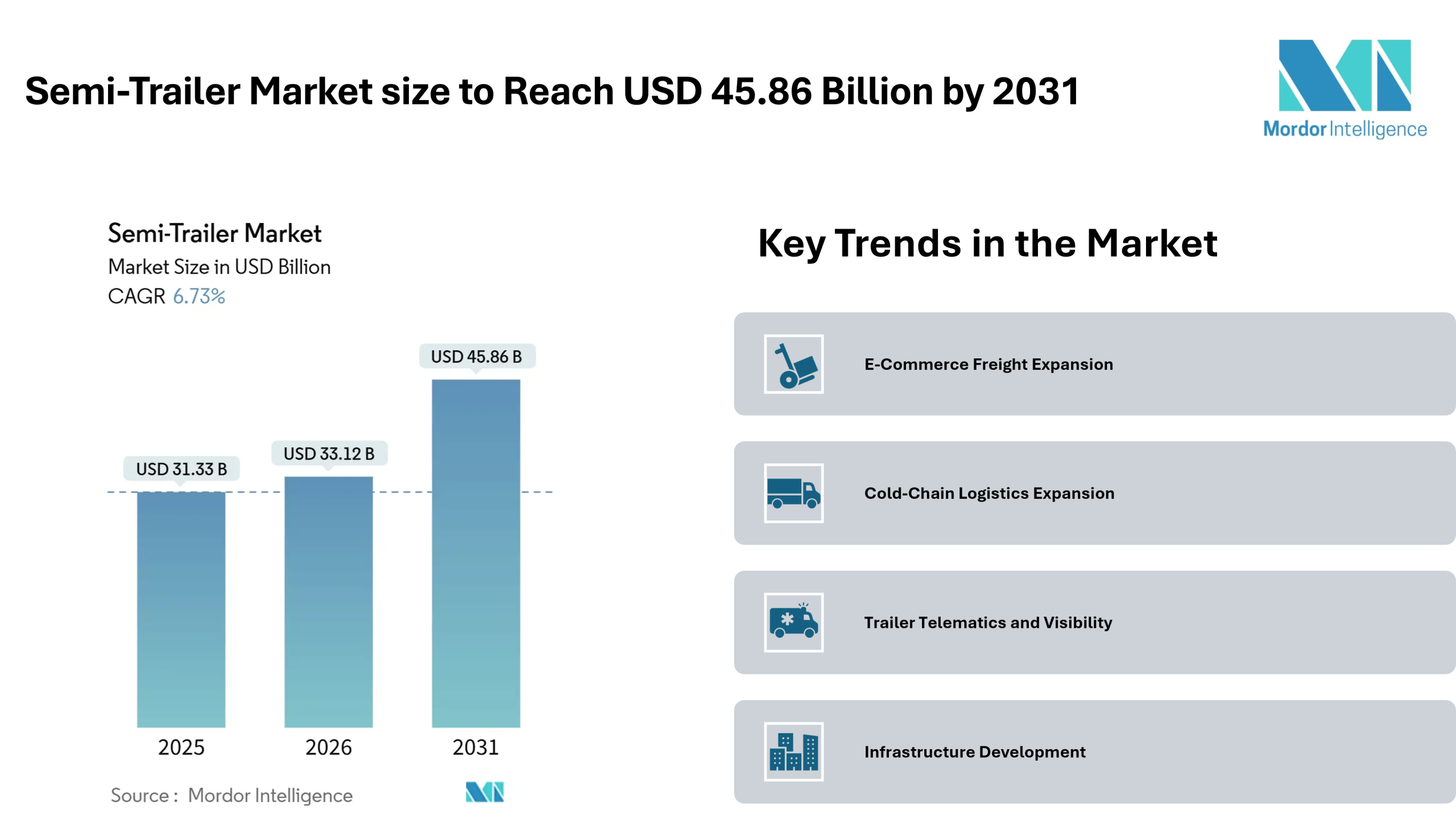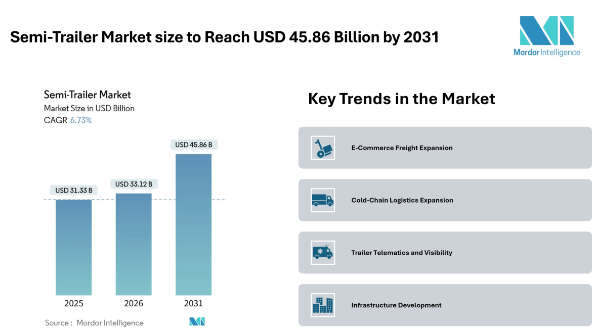 According to Mordor Intelligence, the semi-trailer market size is projected to grow from USD 33.12 billion in 2026 to USD 45.86 billion by 2031, reflecting steady semi-trailer market growth during the forecast period. The semi-trailer market forecast highlights sustained demand across logistics, cold-chain transportation, and infrastructure-linked freight movement.
