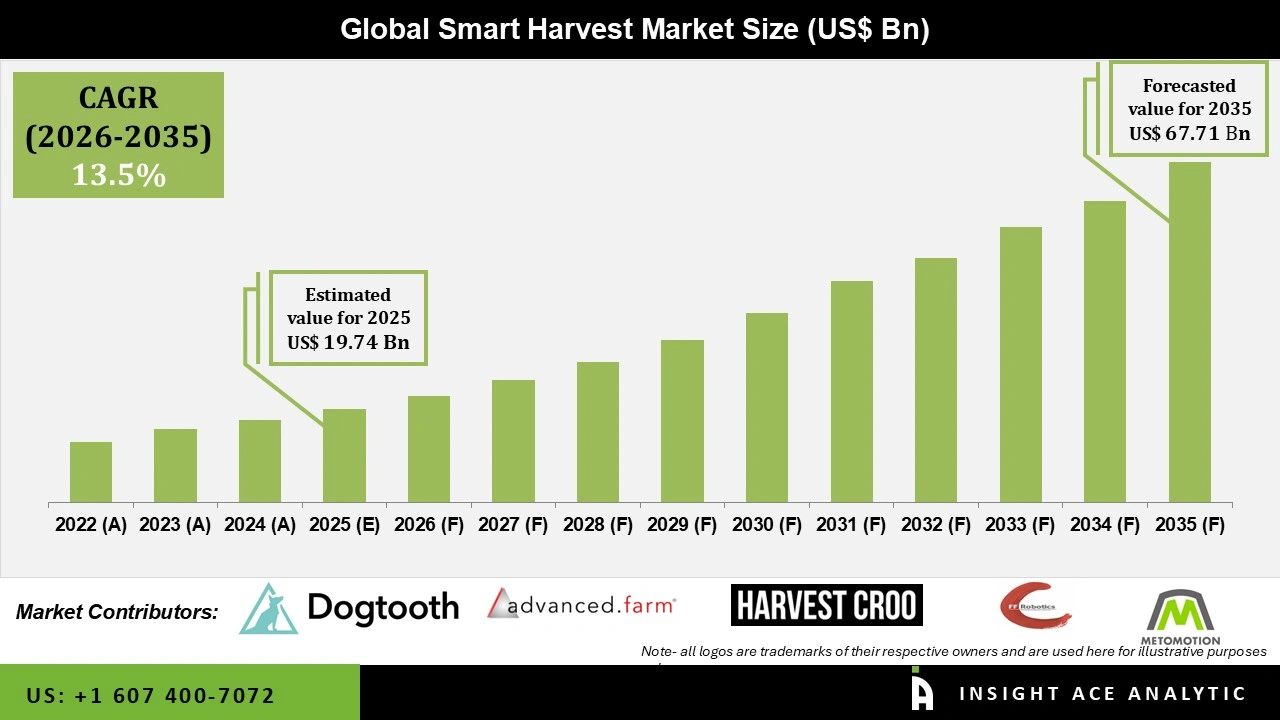 The Global Smart Harvest Market is valued at US$ 19,74 Mn in 2025 and it is expected to reach US$ 67.71 Mn by 2035, with a CAGR of 13.5% during the forecast period of 2026-2035.