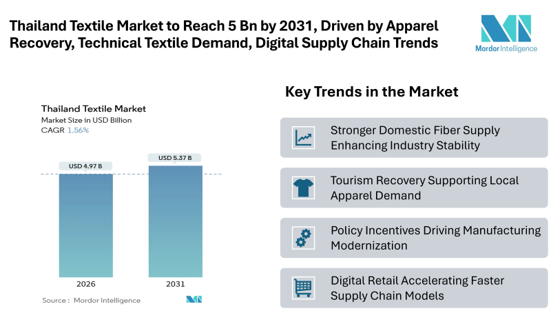 According to Mordor Intelligence, the thailand textile market size is expected to grow from USD 4.97 billion in 2026 to USD 5.37 billion by 2031, registering a CAGR of 1.56% during the forecast period. Growth is supported by domestic tourism recovery, BOI incentives for machinery upgrades, and expanding e-commerce, despite pressures from rising wages and low-cost imports.
